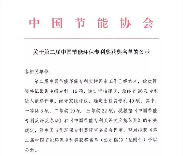 近期,中國(guó)節(jié)能協(xié)會(huì)公布了第二屆中國(guó)節(jié)能環(huán)保專利獎(jiǎng)獲獎(jiǎng)名單。