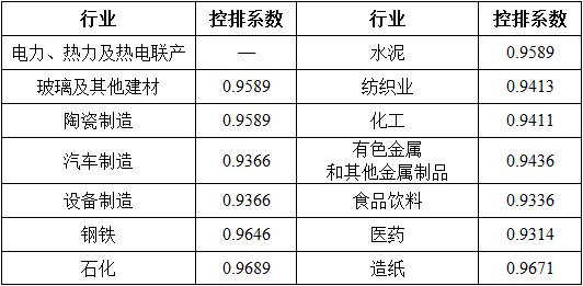 行業(yè)控排系數(具體數值見附件1-1)是用于核定企業(yè)既有設施排放配額的參數。依據各行業(yè)減排成本、減排潛力、行業(yè)競爭力、各行業(yè)碳排放歷史變化趨勢等因素綜合測算確定。