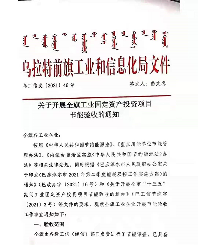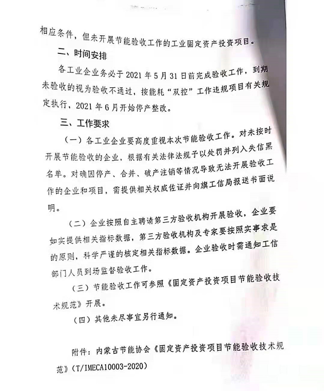 烏拉特前旗:對(duì)全旗工業(yè)企業(yè)開展節(jié)能審查驗(yàn)收,對(duì)期限內(nèi)驗(yàn)收不通過的企業(yè),按能耗“雙控”工作違規(guī)項(xiàng)目有關(guān)規(guī)定執(zhí)行停產(chǎn)整改。