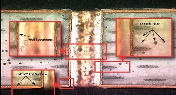 由于微球的存在,電路加工結(jié)構的外觀——例如從一個導電層到另一個導電層的金屬化過孔(PTH)——看起來比沒有采用這種特殊介質(zhì)填料的傳統(tǒng)的線路板材料,制作形成的金屬化過孔要更加粗糙??赡芸雌饋硎沁@樣的,又或者是有什么其他的擔憂,畢竟因為采用中空微球填料的線路板在做金屬化過孔時孔壁非常的粗糙。但一系列的研究表明,無論是在射頻頻率下,還是對5G無線網(wǎng)絡的毫米波頻率下,中空微球填料對金屬化過孔的影響純粹是表面外觀上的,它并不會影響電路的性能或金屬化過孔的可靠性。