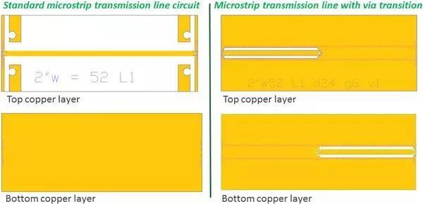 圖3. 這些電路是用于評估金屬化過孔孔壁表面粗糙度對高頻下RF性能的影響的電路設計,左圖是標準的微帶傳輸線,右邊是具有金屬化過孔的微帶線電路。