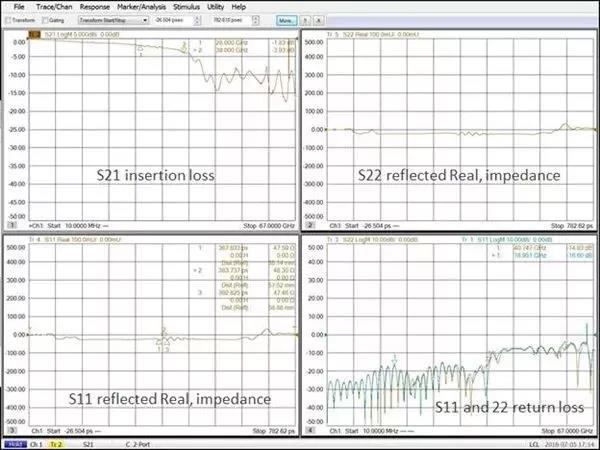 圖4是矢量網(wǎng)絡分析儀測量的頻域和時域的結(jié)果圖。圖右下角的回波損耗(S11和S22)的兩個標記分別表示了不同頻率下的回波損耗值。標記2位于40.7GHz處,是該測試電路具有良好回波損耗的最高頻率。反射波S22的阻抗顯示在圖右上角,反射波S11的阻抗顯示在圖左下角。如S11的標記所示,在通孔轉(zhuǎn)換中的阻抗值,標記1,2和3,電路具有大約48?的阻抗。在通孔過渡區(qū)域中可觀測到較小的阻抗變化,阻抗變化小于2?,對電路的RF性能幾乎沒有影響。從這些測試結(jié)果,電路可被認為從頂層到底層信號具有的良好的通孔過渡,同時,它還具有到40GHz的良好插入損耗性能(如圖左上角所示)。