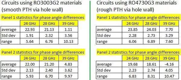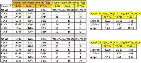 圖5中的電路ID可以顯示電路來自哪個12×18英寸的大板,以及該板上的電路ID編號。例如,P1 C4來自板1,電路編號為4號。電路彼此之間互相遠離并均勻地分別在12×18英寸的板上,以保持一致性。某些變化是可以事先預料到的,因為它們對相位角的差異非常敏感。某些變化是由于PCB制造過程而造成的,而不是金屬化過孔壁粗糙度的原因,包括導體寬度的變化,鍍銅厚度的變化和鉆孔質(zhì)量的變化。此外,金屬化過孔周圍的縫隙由于PCB的正常制造公差也會出現(xiàn)一些變化。同樣,每個板上的微小材料變化,如Dk值的微小變化,也可能導致相位的變化??紤]到圖5所示的測試值,在39 GHz時相位數(shù)據(jù)的可重復性標準差小于±1.2度,這是非常好的。